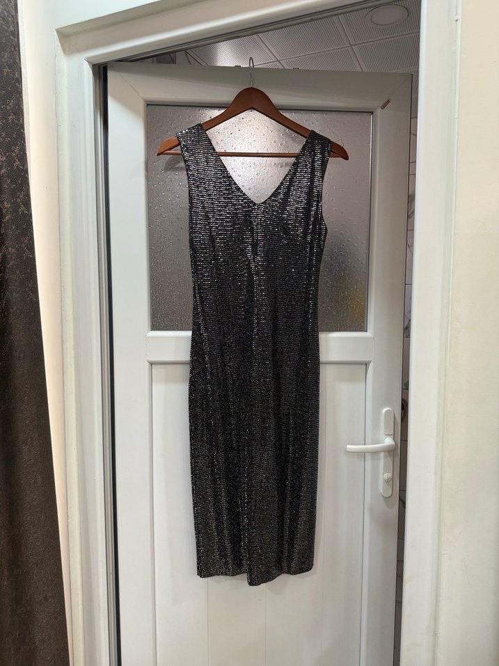 Kolsuz, uzun ve dar kesim kadın elbise, V yakalı ve drapeli, koyu gri yılan desenli, göz alıcı parti tarzı için uygun.