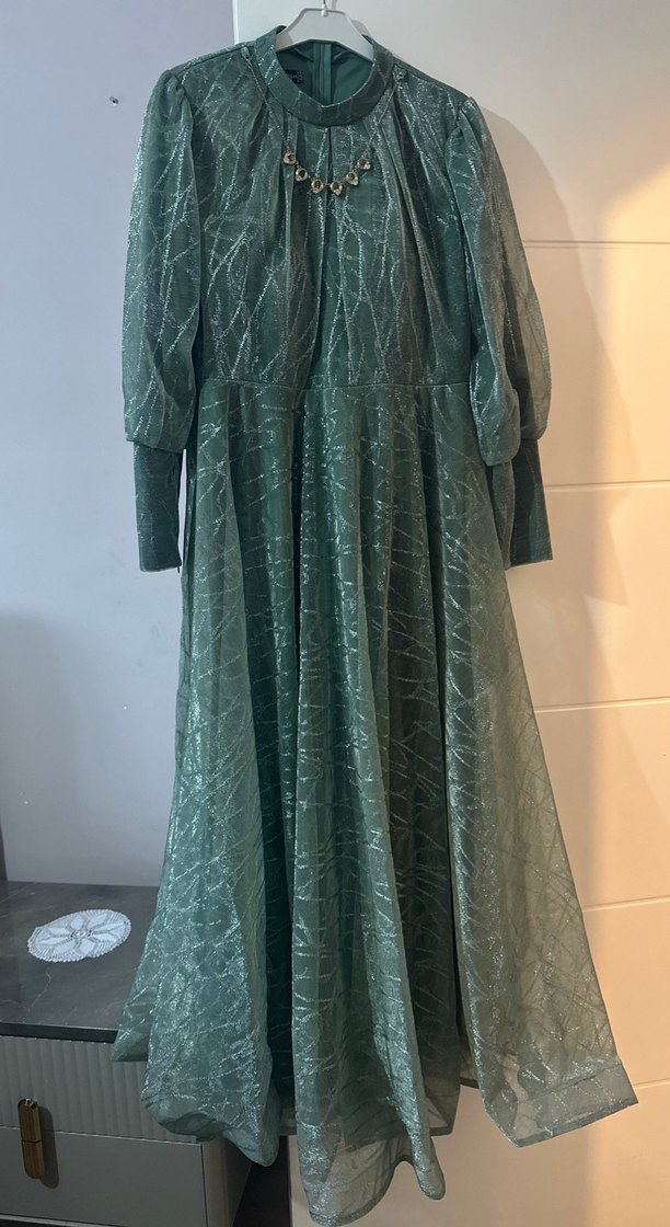 Parlak yeşil yılan desenli, uzun kollu ve yüksek yakalı, bol kesim kadın elbisesi. Bohem tarzda drapeli, düğünler için uygun.