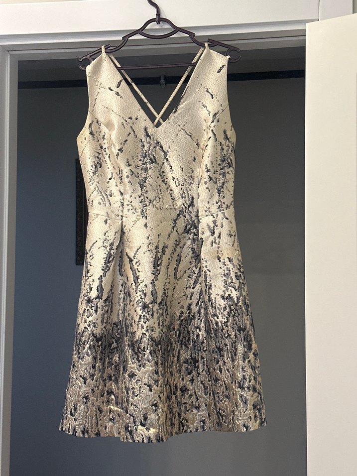 Kolsuz, V yakalı ve drapeli bu midi elbise, bej ve gri yılan desenine sahip. Şık ve Paris esintili, ofis için uygun bir modeldir.