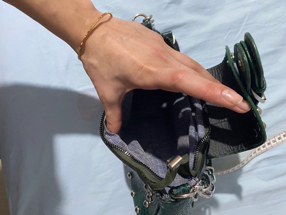 Yeşil deri kadın çanta, yılan desenli ve fermuarlı. İç kısmı desenli kumaşla kaplıdır. Sokak modasına uygun, günlük kullanıma elverişli.