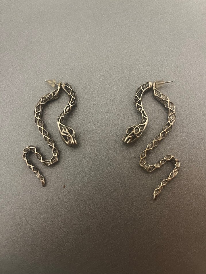 Gri yılan desenli, zincir detaylı midi uzunlukta gotik tarzda küpeler. Romantik akşamlar için uygun.
