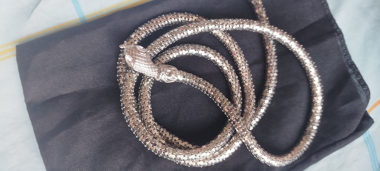 Gri yılan desenli kadın el zinciri, zincir detaylarıyla bohem ve göz alıcı tarzı günlük kullanıma sunar. hem kemer hem kolye