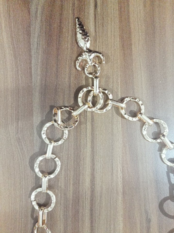 Altın renginde, yılan desenli ve zincir detaylı kadın kolye i, günlük kullanıma uygun bohem tarzda.