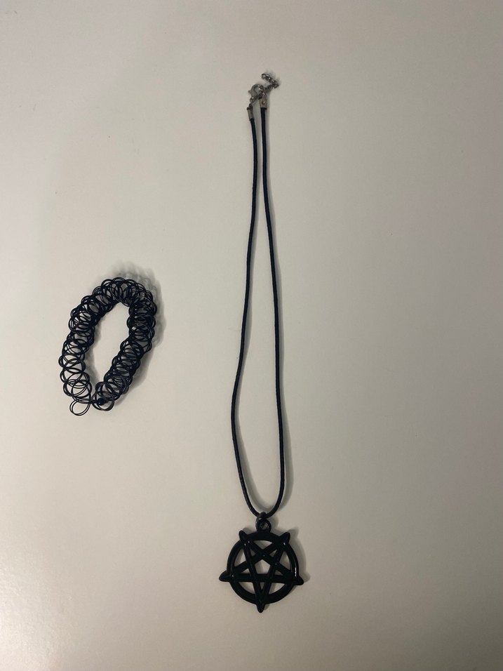 Zincir detaylı, yılan desenli siyah gotik kolye, pentagram figürlü. Rock punk havası ve günlük kullanım için uygun. Yanında crocks hediye