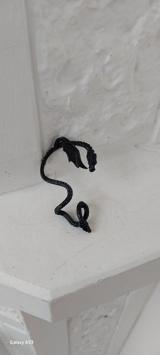 Yılan desenli ve zincir detaylı siyah ear cuff, goth tarzı ve rock punk havası için uygun.