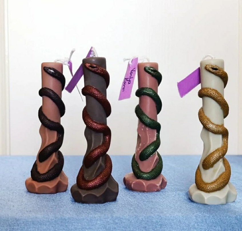 Karanlık çok renkli mumlar, her birinin etrafını saran yılan detayıyla dikkat çekiyor. ️ Vanilya kokuludur.