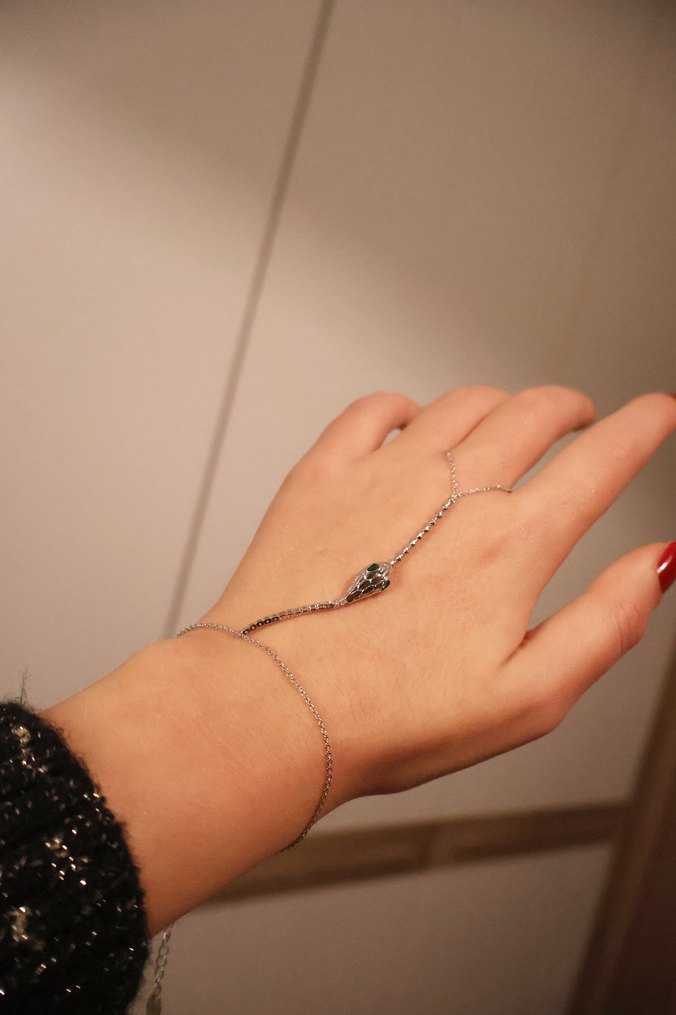 Kadın el zinciri, koyu yılan desenli ve turkuaz detaylı, gotik ve minimalist tarzı günlük kullanıma uygun şekilde birleştirir.