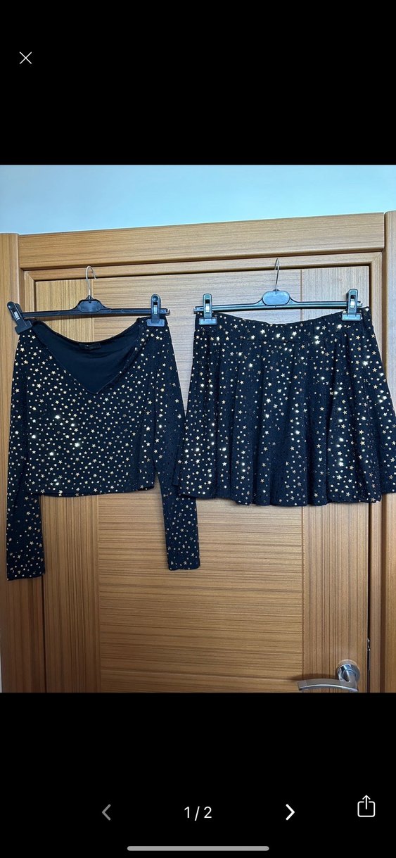 Gold yıldız detaylı bluz ve etek takım L beden ama M-L uyumluysanız kullanabılırsınız esnek kumaş ve beli lastikli. Ürünleri tek almak isteyen yorum yazabilir Sentetik kumaştan, payetli desenli, siyah ve dar kesim mini etek. Gösterişli partiler için uygun. ✨