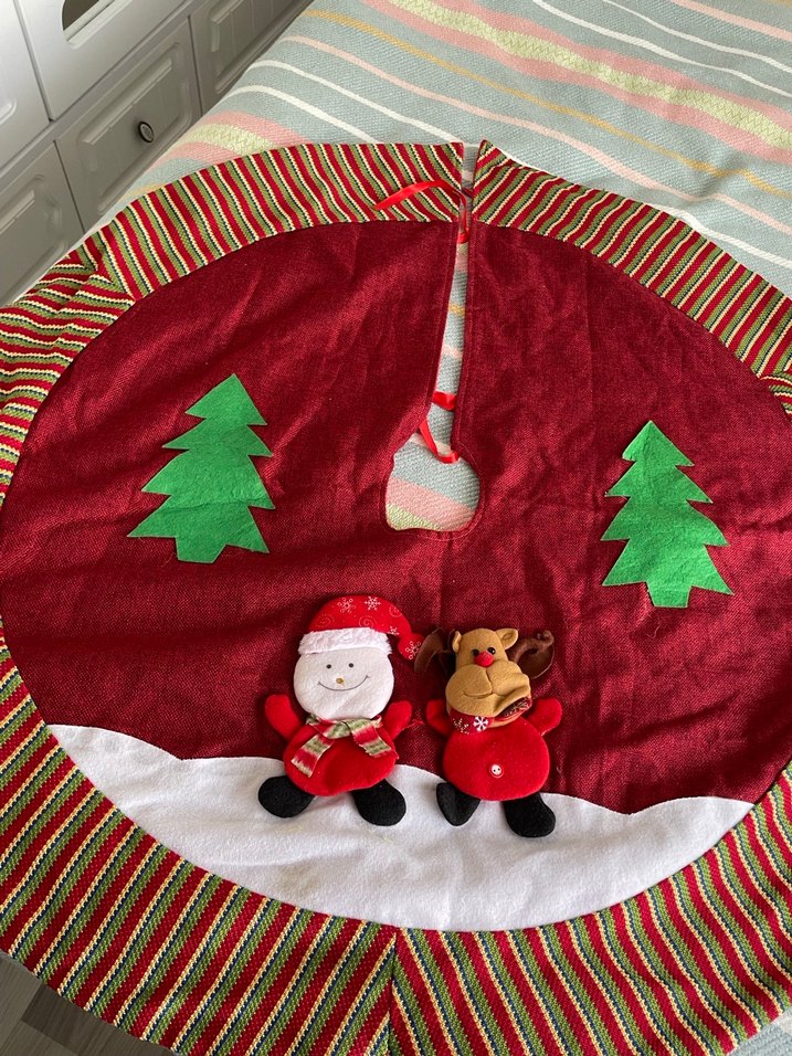 Kırmızı Noel ağacı eteği, yeşil çam ağaçları ve peluş Noel Baba ile geyik figürleri içerir, renkli çizgili kenarlıklıdır.