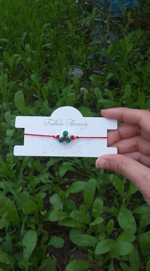 Renkli yeşil boncukların kırmızı ip üzerine dizildiği, minimalist bohem tarzda kadın bileklik. Açık hava kullanımı için uygun. Seramik boncuktan tasarlandı.