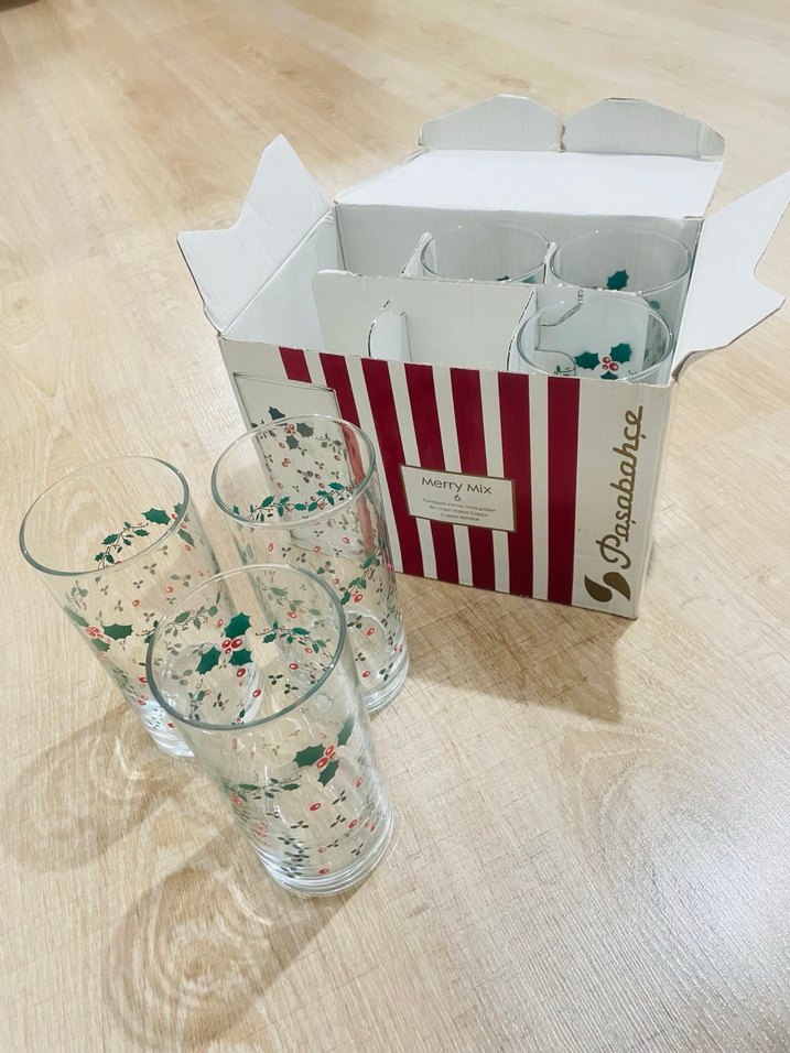 Canlı yılbaşı çiçek desenleriyle süslenmiş altılı cam bardak seti, günlük kullanım için uygundur.