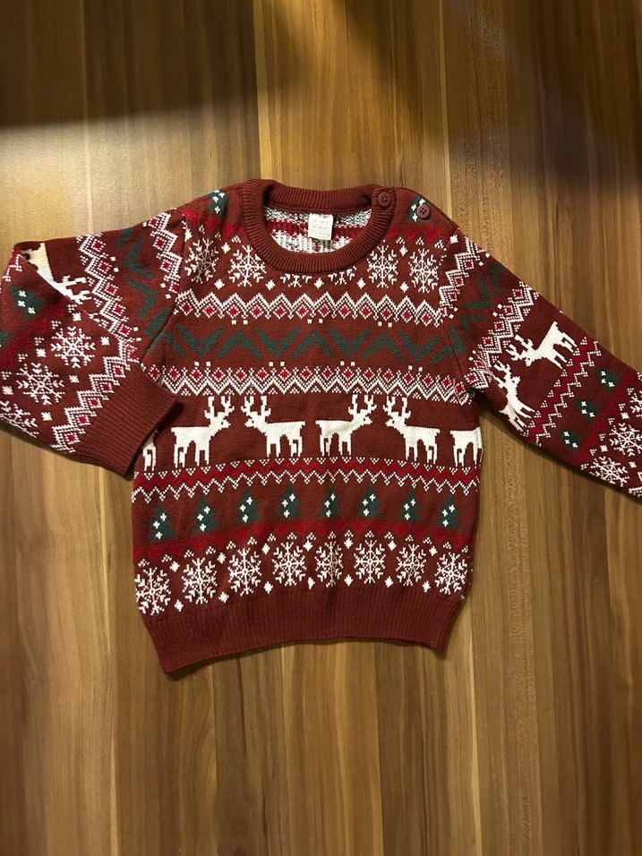 Bordo renkli, beyaz geyik ve kar tanesi desenli, uzun kollu, bisiklet yakalı çocuk triko kazak. 1-2 defa ancak giyildi, tüylenme vb hiçbir sorunu yok. 24-36 ay , 92-98 cm, 12,5-14,5 kg için uygundur. Hızlı kargo yapılır.