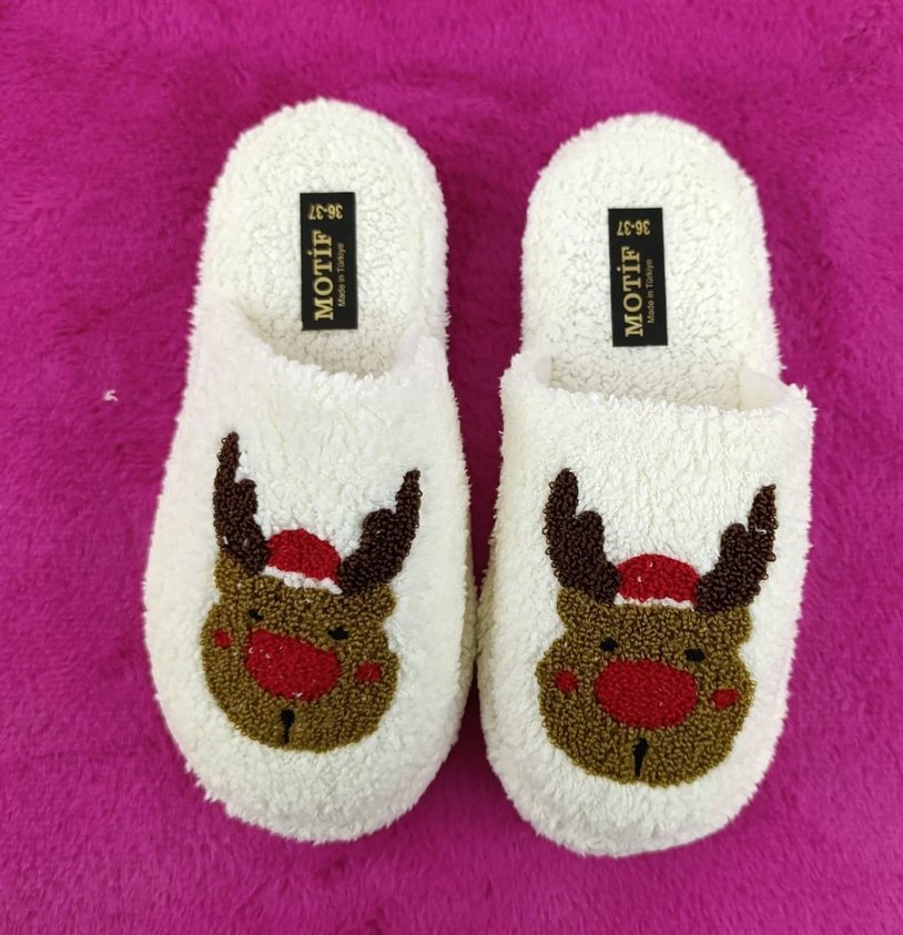Yumuşak kürk detaylı, renkli nakışlı geyik desenli beyaz kadın ev terliği, rahat kullanım için uygundur. urunun 36-37-38-39-40 numaraları mevcut