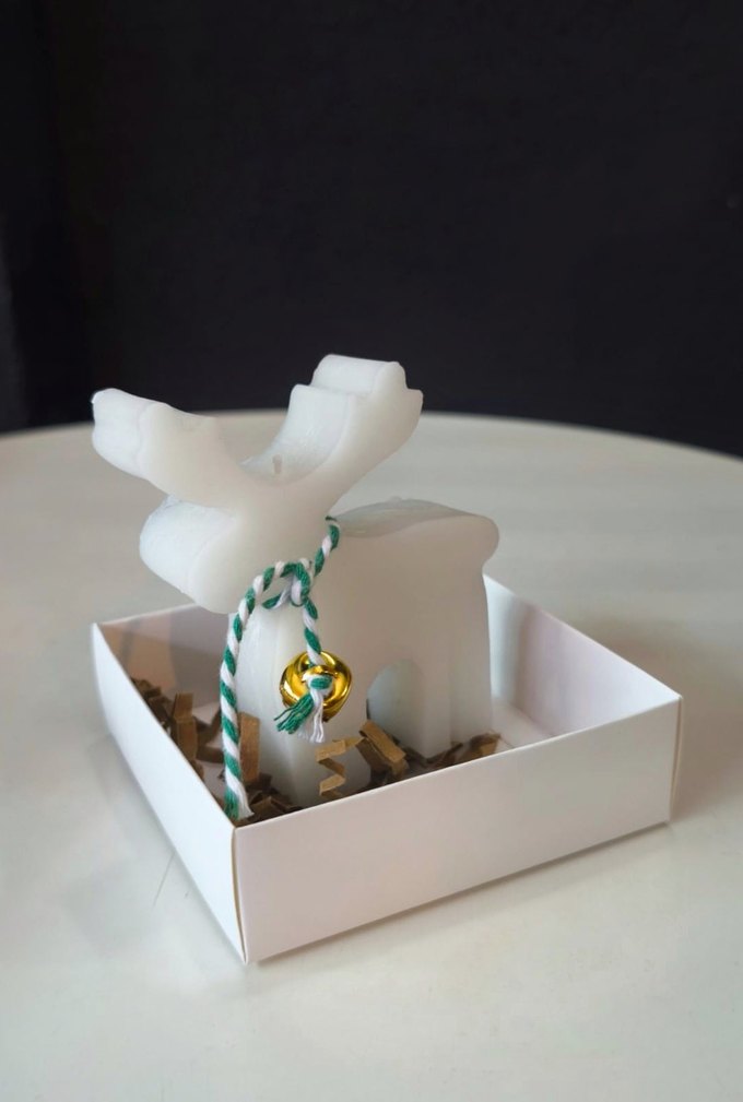Yeşil-beyaz ip ve küçük altın çanla süslenmiş geyik şeklinde mum, beyaz kutuda yer alıyor. ️