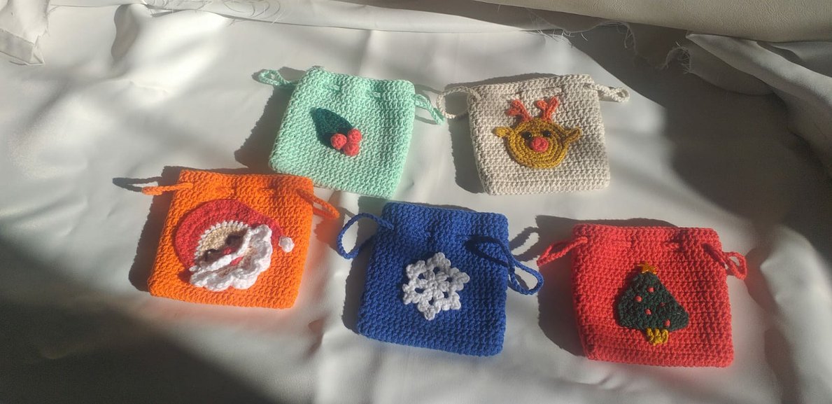 Bohem tarzı, farklı desenlerle süslenmiş renkli el örgüsü çantalar. Her çanta ipli kapanışa ve özgün nakışlara sahiptir. İstenilen sayıda yapılır.