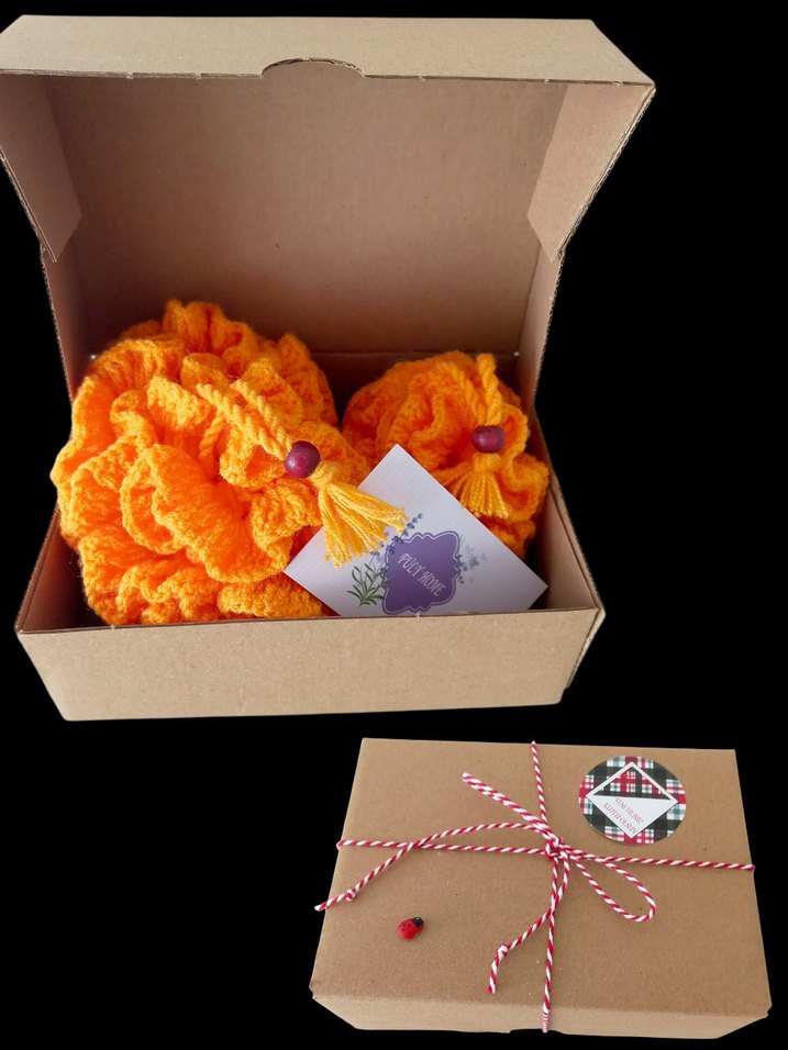 Yumuşak dokulu, turuncu renkli duş seti sade kahverengi kutuda, dekoratif ip ile paketlenmiştir. Paket içeriği 1 adet vücut lifi, 1 adet yüz lifi bulunmaktadır. El emeği ürünlerdir.