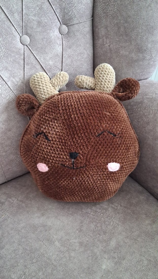 Yumuşak dokulu kahverengi geyik şeklinde peluş oyuncak, gri boynuzlu, kapalı göz ve pembe yanak işlemeli.