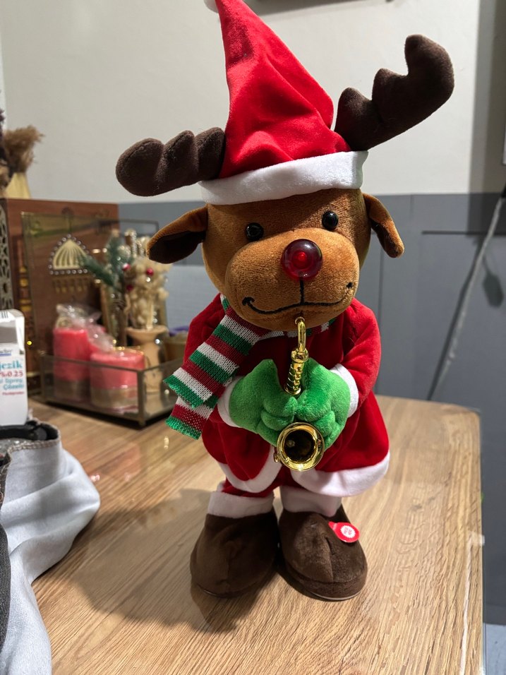 Kırmızı Noel kıyafeti giymiş, çizgili atkılı renkli geyik figürü. Küçük saksofon tutar, kahverengi gövde ve kırmızı burunlu pilli müzik çalıp dans ediyor .