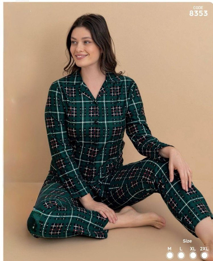 Kadınlar için koyu yeşil kareli, uzun kollu, rahat kesim pijama takımı. Sokak stilinde konforlu ve sıcak bir seçenek. M L XL bedenleri bulunmaktadır