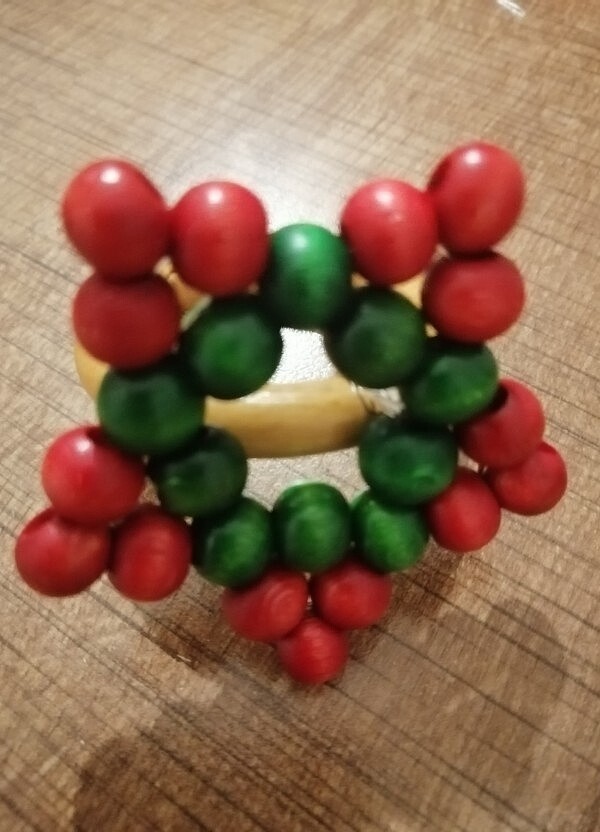 Yeşil ve kırmızı boncuklu ahşap halkalı yılbaşı sofraları için hoş bir peçete yüzüğü 5 lı fiyatıdır