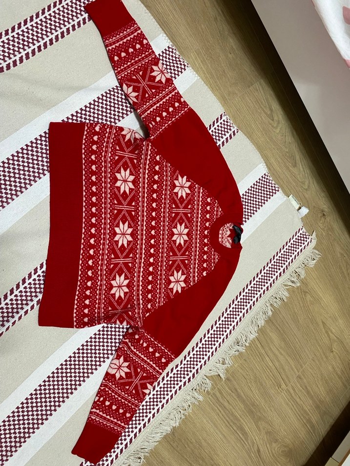 Kırmızı renkli, desenli örgü kumaştan yapılmış, uzun kollu ve V yaka kadın kazak. Rahat kesimi ve normal boyuyla gündelik şıklık için uygundur. %100 yündür kesimi biraz kısadır. S bedene de uyar