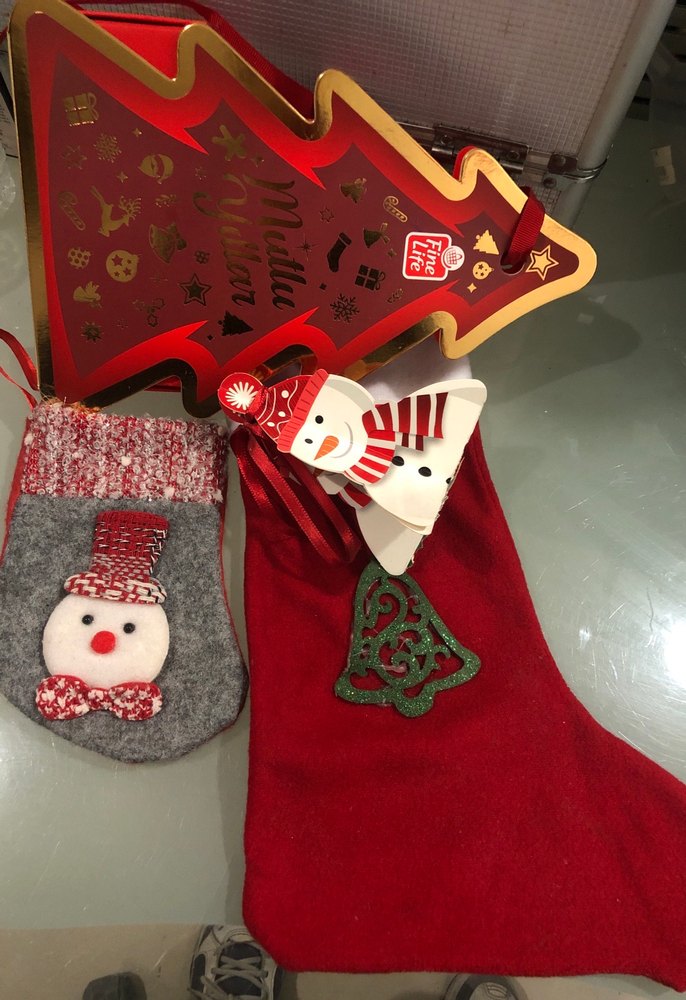 Kırmızı ve gri yılbaşı çorapları, kar adam süslemeleri ve ağaç şeklinde kutu içeren set, tatil kutlamaları için uygundur dörtlü yılbaşı konsepti