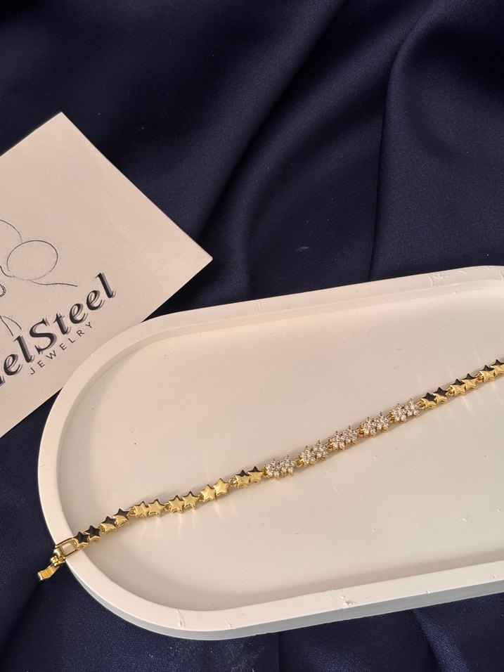 Zincir detaylı ve işlemeli yıldız desenli, parlak altın renk bileklik. Romantik akşamlar için modern klasik tarzda tasarlanmıştır. ✨