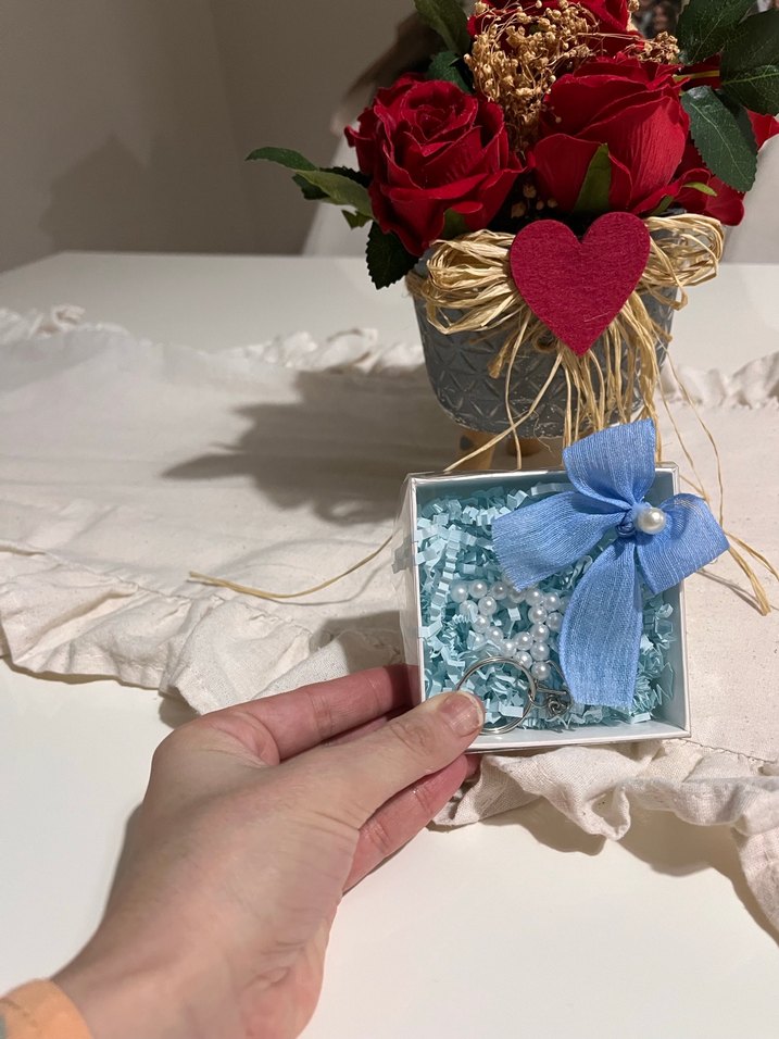 Pastel mavi kurdele ve inci detaylarıyla süslenmiş, küçük dekoratif boncuklar içeren hediye kutusu. Mevlüt hediyeliği doğum günü hediyeliği elimde 45 adet mevcut göründüüğü gibi gelicektir