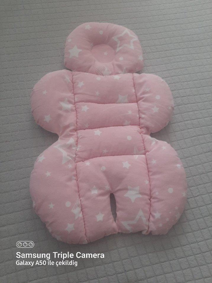 Yumuşak ve sıcak kumaştan yapılmış, yıldız desenli pembe bebek minderi, konfor ve destek sağlar.cift tarafli