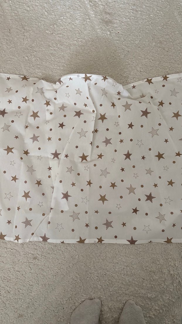 Beyaz zemin üzerinde çeşitli boyutlarda açık renk yıldız desenleri bulunan yumuşak bir emzirme önlüğü.⭐
