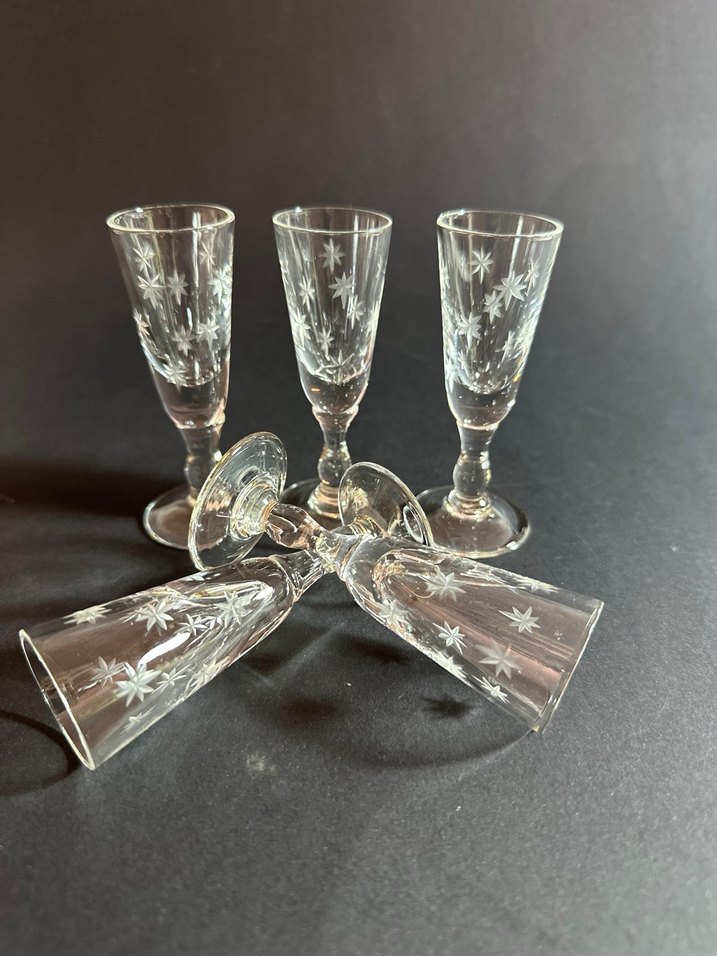 Yıldızların ışıltısı sofranızda! Tür: El Kesmesi Kristal Likör/Votka Kadeh Seti Dönem: Vintage (Mid-Century) Kusursuz işçilik, yüksek kondisyon.