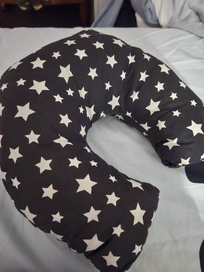 Koyu siyah zemin üzerine beyaz yıldız desenli, rahatlık ve destek sağlayan hamile ve emzirme yastığı, boyun yastığı olarak da kullanılıyor. ⭐ Hiç bir kusuru yoktur.