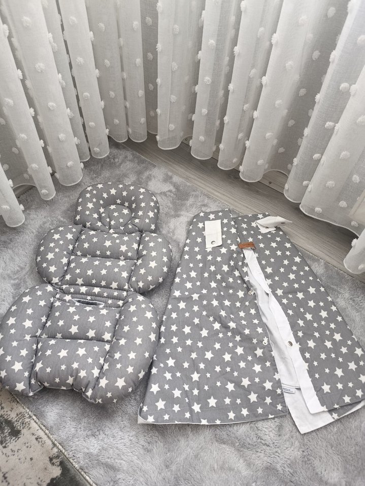 Gri renkli, yıldız desenli bebek uyku seti, yumuşak sentetik kumaştan yapılmış minder ve uyku örtüsünden oluşur. puset takimi yep yeni tertemiz .