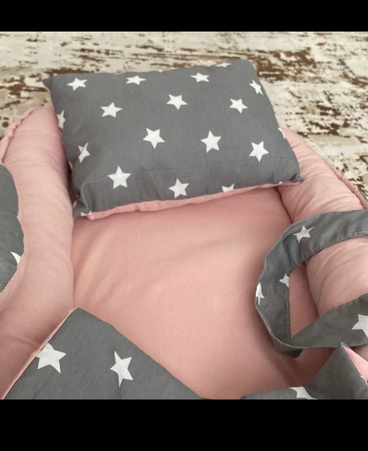 Gri yıldız desenli yastık ve yumuşak pembe uyku minderi içeren sentetik kumaştan yapılmış 1adet beybi Nest yatak 1 adet C yastık 1 adet küçük yastık Üst örtüsü alt açma minderi mevcut temiz kullanılmıştır