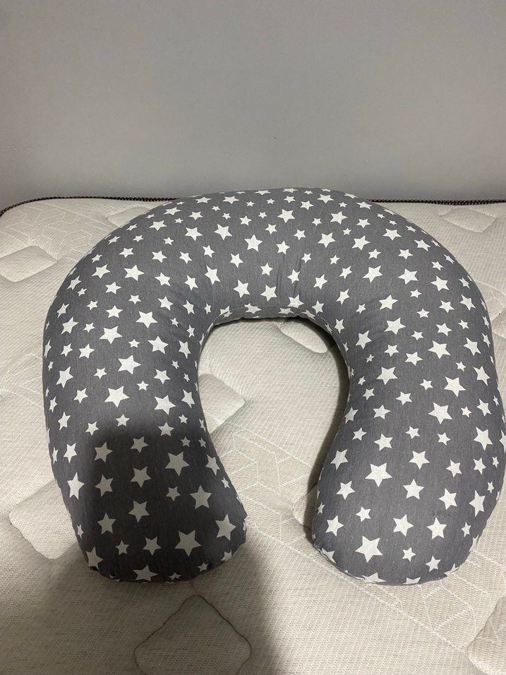Gri renkli, yıldız desenli emzirme ve hamilelik yastığı, konforlu destek sunar. ⭐