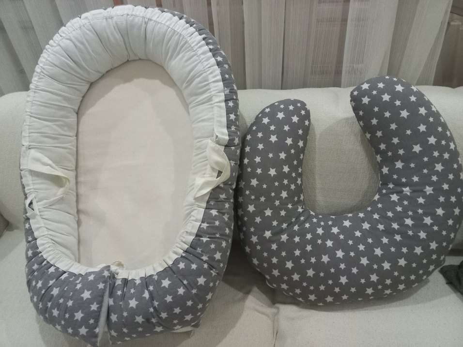 Anne yanı bebek yatağı ve kafa yastığı içinde Hamilelik ve emzirme sürecinde rahatlık sağlayan, yıldız desenli gri yastık.