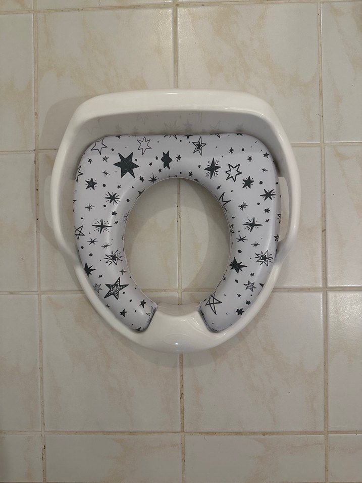 Gri yıldız desenli, beyaz zeminde klozet adaptörü. E-bebekten alındı. Hiç kullanılmadı. Kutusunu attım.
