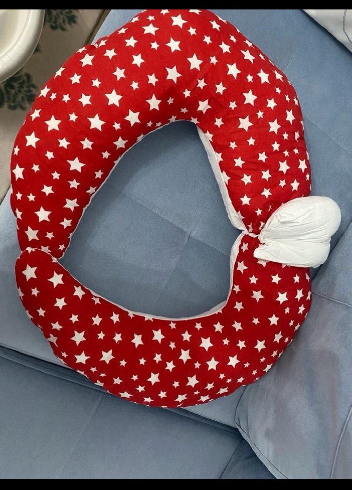 Kırmızı zemin üzerinde beyaz yıldız desenli, hamilelik ve emzirme için destek sağlayan yumuşak yastık.