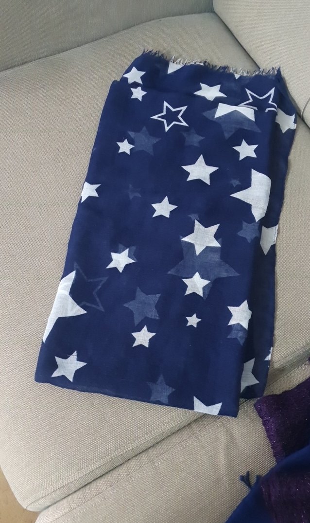 Yumuşak sentetik kumaştan, beyaz yıldız desenli ve drapeli lacivert kadın atkısı, rahat bir kullanım sunar. Bohem stil için uygundur.