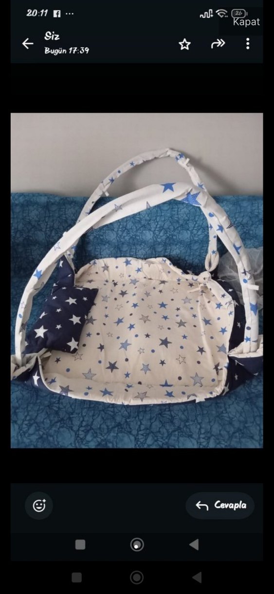 Yıldız desenli, mavi ve gri tonlarda baskılı sentetik kumaştan yapılmış bebek oyun minderi. Taşıma için dolgulu kenarlar ve saplar bulunur.