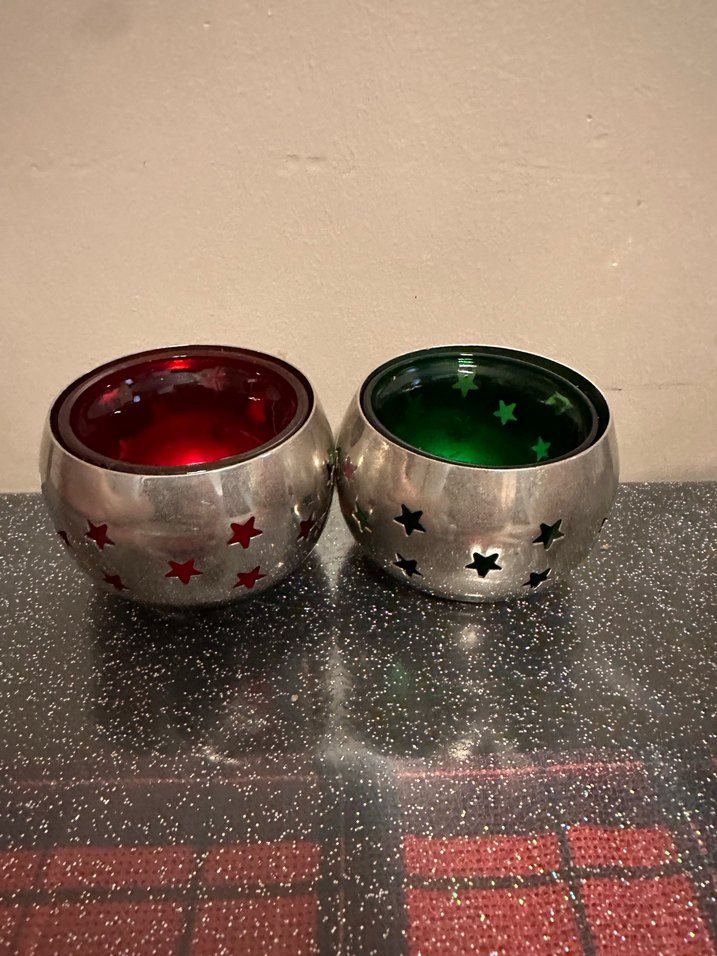 Yıldız desenli kesimlere sahip, biri kırmızı diğeri yeşil iç yüzeyli iki yuvarlak metal mumluk seti. ️