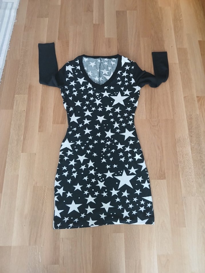 V yaka, uzun kollu, yıldız desenli siyah mini triko elbise. Say marka, markayı bilen bilir çok pahalıya alındı. Yumuşacık trikosu var