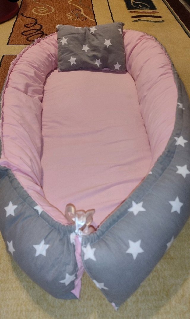 Pembe zeminli ve gri yıldız desenli yanlara sahip, sentetik kumaştan yapılmış bebek yatak seti. Yıldız desenli uyumlu yastık dahildir. Yırtık vs yoktur uzun sürede kullanılmadı. Gayet kullanılır durumda. plaka. 33 elden teslim.