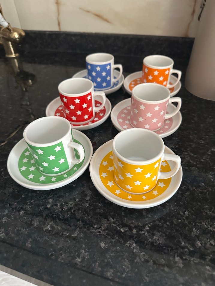Yeşil, sarı, kırmızı, pembe, turuncu ve mavi renklerde yıldız desenli kahve fincanları ve tabakları seti. ☕