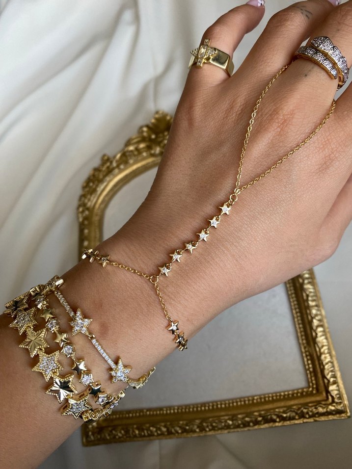 Altın renkli, zincir detaylı kadın el zinciri. Bohem ve ışıltılı tarzda, günlük kullanıma uygun. ✨