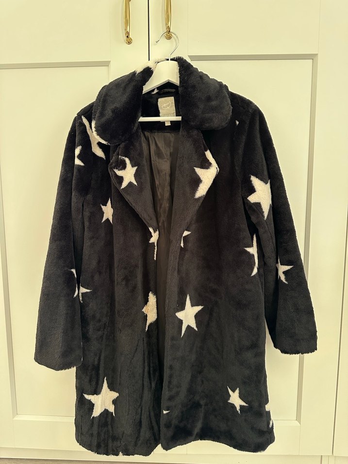 Siyah peluş kaban, yıldız desenli ve kesik yaka detaylıdır. Bol kesim, uzun kollu ve midi boydadır. Yumuşak ve sıcak kumaştan üretilmiştir.