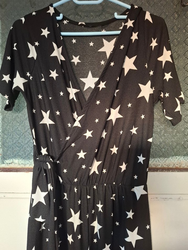 Siyah uzun tulum, yıldız desenli ve V yaka. Kısa kollu, bol kesim, yumuşak sentetik kumaştan, parti için uygun. ⭐ Ürün hiç kullanılmamıştır.