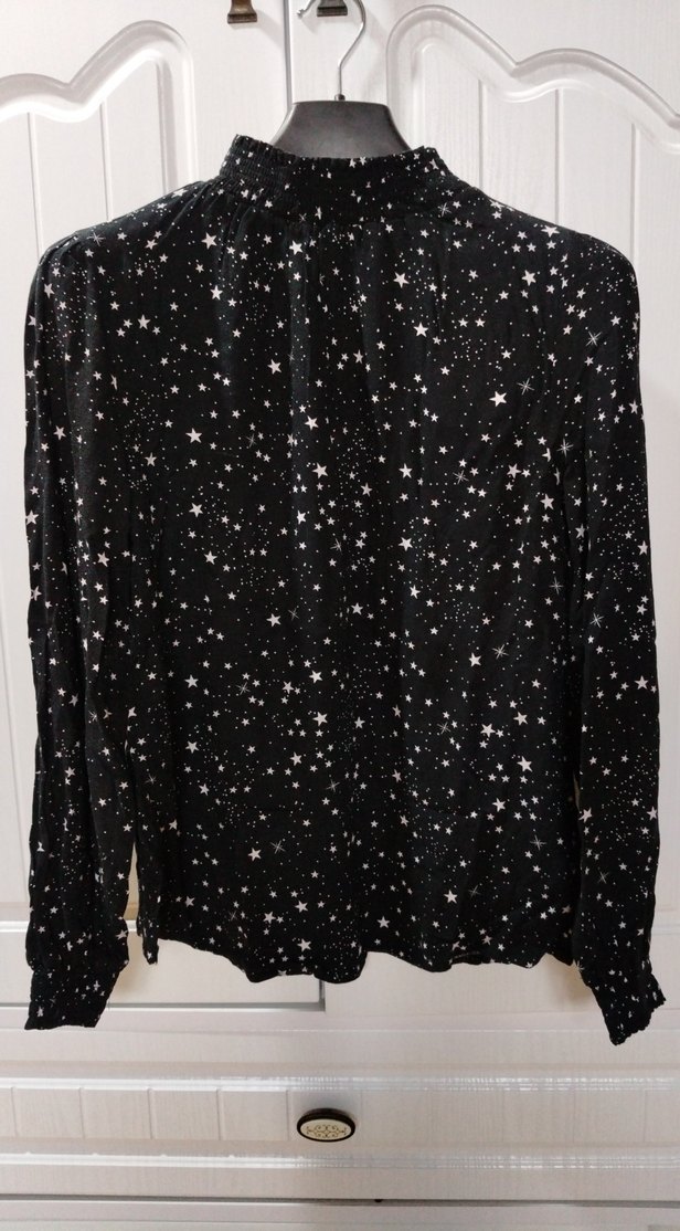Siyah bluz, uzun kollu ve düğmeli yüksek yakaya sahip. Rahat kesimi ve yıldız desenli baskısıyla gündelik kullanıma uygundur.