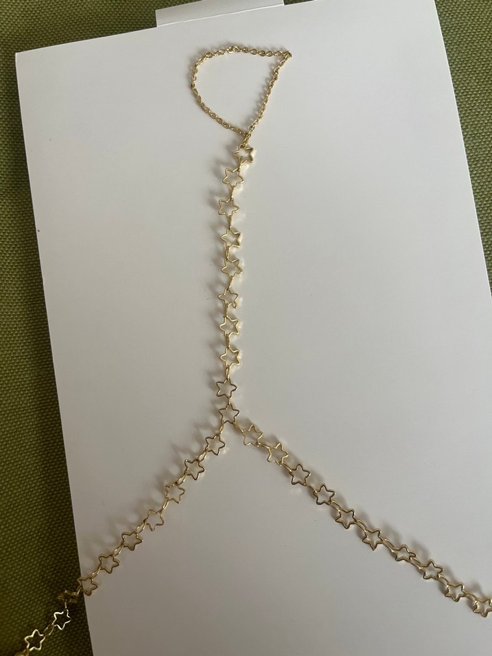 Parlak altın renkli ve yıldız detaylı zincirden oluşan bohem tarz el zinciri, düğün ve minimalist görünümler için uygundur. ✨