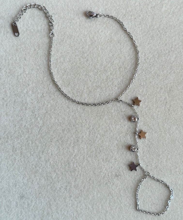 Gri zincir ve yıldız ile küçük kristal detaylı bohem tarzı kadın el zinciri, günlük kullanıma uygun. ✨